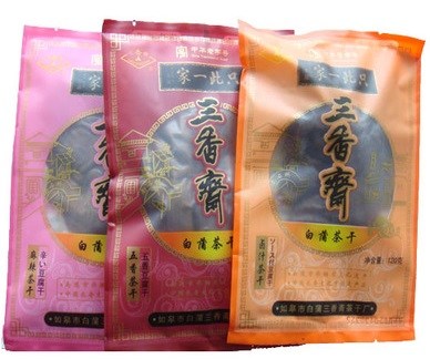 “三香斋”的来历: 据《如皋县志》记载,公元三九七年即隆安元年,晋安帝司马德宗家已将白蒲置为“蒲涛县地”,距今已有一千六百多年的历史。“白蒲茶干”始制于清朝康熙年间,一们姓屠的湖州人在白蒲北街开的一豆腐干店,店号“三香斋”,又名“屠三香”、白蒲北街是南北交通要道,商业较盛,油饼粮行,京货店,水烟栈,各式菜馆,点心店 ,鱼行、茶馆等店铺林立,来往商人,小贩很多,每日清晨,商民,街坊乡老,小贩等都喜欢坐茶馆,闲谈生意经,山海经,一边谈心,一边买来屠氏的豆腐干佐茶。因其近似茶色,又是名茶配食的佳品,故取名茶干。到康熙丙子年(康熙三十五年,即一六九六年),“屠三香”生产的茶干由于加工工艺精细,用料考究进嘴细软劲韧,美味可口,算得上色、香、味俱佳,茶干上模压店号,很有特色,被誉为白蒲一绝。清朝乾隆皇帝下江南时,地方官特别选择了“三香斋”茶干作为贡品,请皇上品尝,乾隆尝后甚悦,又听该店独家经营的介绍 ,便御笔写下“只此一家”的题字,赐予褒扬。屠氏得此御笔欢喜欲狂,并将“只此一家”制成金字匾额,悬于店堂,自得御笔“只此一家”,“三香斋”茶干驰名大江南北。嗣后“三香斋”茶干店,生意更加兴隆。
