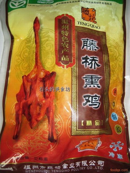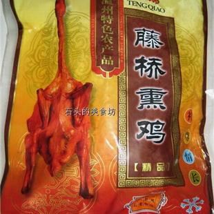 藤桥熏鸡,温州传统名品,以农家本地三黄鸡(山地放养,食虫、蚁、五谷)为主要原料,辅以藤桥百年传统配方及工艺精制而成,无污染,营养价值非常突出。从宰杀、整形、油炸、蒸煮、抹蜜、搭色等,规范操作,十分考究。制成的藤桥熏鸡光泽鲜亮,表皮干韧,肉瘦香脆,熏香浓郁,肥而不腻,入口脆烂,回味无穷,味道极其鲜美。