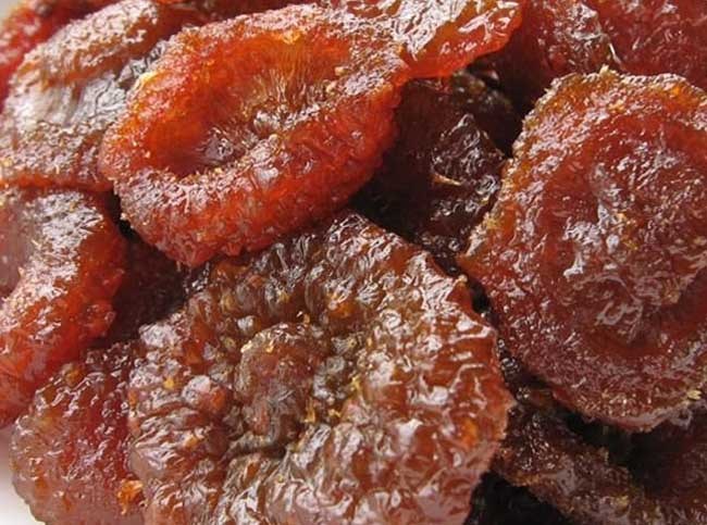盘县刺梨果脯的质量特色具体分外形、色泽、滋味、肉质等四个方面。外形方面,盘县刺梨果脯大小一致,成均匀块状,无杂质,无霉状,给人赏心悦目的感觉。上等的盘县刺梨果脯块状较大,质地软硬适度,果肉柔软滋润,不粘手,不“流糖”,不“返砂”。色泽方面,盘县刺梨果脯黄色透明鲜亮,易于保存,久存也不会褐变为黑色,这是盘县刺梨果脯最显著的特点。滋味方面,在加工的过程中,去除刺后采用特殊方法将刺梨中的天然苦涩味(丹宁)剔除,使得盘县刺梨果脯适口性好,味道酸甜适中,柔软化渣,无异味。肉质方面,盘县刺梨果脯内涵丰富的维生素和碳水化合物,经测定,100g盘县刺梨果脯中,能量为1282KJ,蛋白质为1.3g,碳水化合物为74.2g,钠为106mg,维生素C为1620mg。与别处所产果脯对比,盘县刺梨果脯有天然的优势,选用维C之王刺梨为原料,维生素C含量自然高。