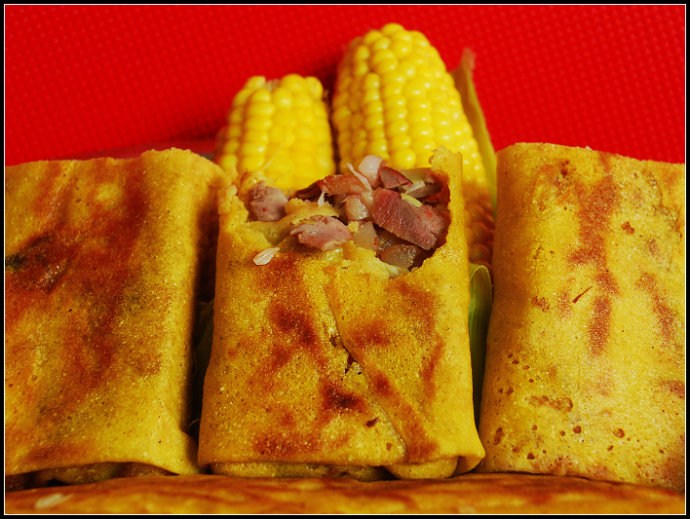 涞源农村家家户户会摊煎饼。过去缺乏细粮,过年过节老百姓便粗粮细做,腊月里每家都摊两斗或三斗粮食的煎饼,乘热将饼折叠成长方形,整齐地码放在笸箩里,留着正月里慢慢吃。