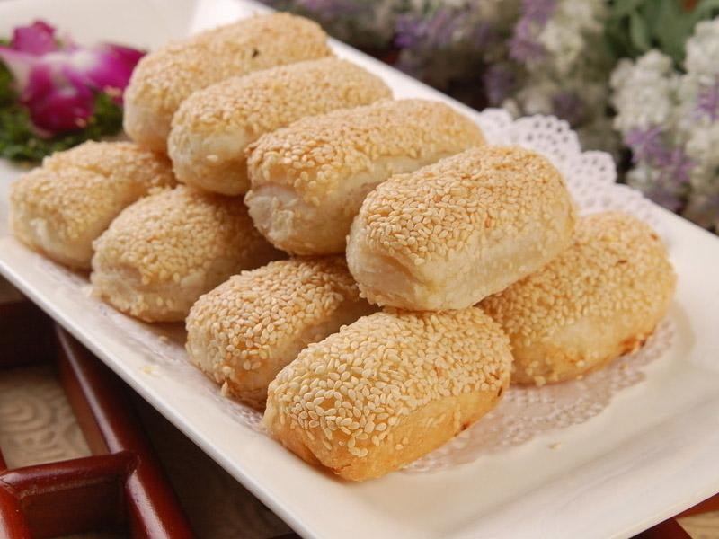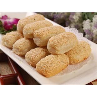 芝麻。所用的面粉必须是中筋,强筋和弱筋却不宜制作,所用芝麻必须去皮,去皮的芝麻不得改变它的色泽与形状,一般有咸甜两种口味,讲究的做法是以上等肉松作为馅料!