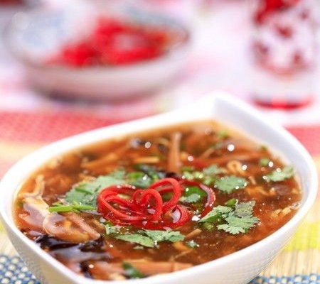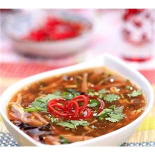 酸辣汤的制作原料是:豆腐30克,熟鸡肉(或火腿)、冬菇、熟瘦猪肉丝、水发海参、水发鱿鱼各15克,鸡蛋1个,淀粉25克,葱花3克,酱油10克,猪油30克,味精、胡椒粉各1克,香醋6克,精盐5克,鸡汤750克。 酸辣汤烹饪方法: