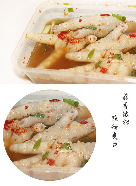 主料:精选优质鸡脚配料:糖、醋、小葱、老姜、大蒜头、辣椒、盐、料酒,不含防腐剂不含添加剂规格:500g/袋(真空包装)特点:鲜酥、味浓、微辣、略甜食用:开袋即食 可微波微热 请置于阴凉通风处或冷藏。