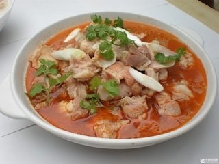 结合民间传统红汤羊肉汤的手法,以羊骨汤为基,将煮熟的羊油配合单县当地红辣椒捣碎后熬制成红油浇入,羊肉采色泽红亮,红而不辣,水脂交融,鲜而不膻,香而不腻。