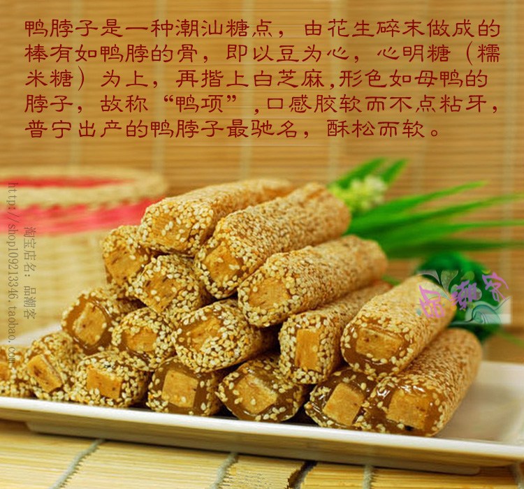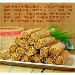 鸭脖子糖是一种潮汕茶点,由花生碎末和糯米糖做成,以花生为心,糯米糖为皮,在裹上一层白芝麻,形如母鸭的脖子,故称鸭脖子,又称鸭项。口感娇软而不粘牙,里脆外软,其中以普宁出产的鸭脖子最为驰名。