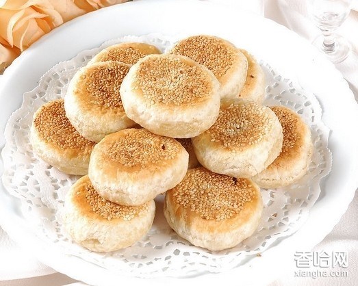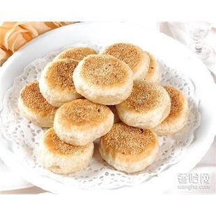 馅料:蒸熟标准粉8.25千克糖桂花1千克炒熟糯米粉1.05千克熟猪油3.5千克绵白糖11.5千克熟芝麻(贴麻用)16千克制作方法:1.制皮:将特制粉摊成盆状,将熟猪油、饴糖倒入其中,加入熟水拌匀制成面团。2.制酥:先将糖、糖猪板油放在一起擦透,使脂肪泄出,再加水,加入熟面粉,桂花拌匀。3.制饼坯:用大包酥方法,一分皮子包一分酥和馅料,揿成圆饼,二面沾水和沾白芝麻,摆在铁盘里。4.烘焙:将饼坯放进烘炉,2分钟后,当饼皮开始泛白时,将铁盘取出,逐个翻身,再进炉烘焙,约5分钟后,待饼皮鼓起,饼色泛黄,芝麻膨胀时,便已熟透,出炉冷却后装箱。5.贮存:由于该饼酥脆,装箱时宜轻拿轻放,以防酥皮破碎和芝麻脱落,并储于通风阴凉处。