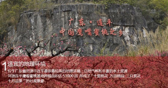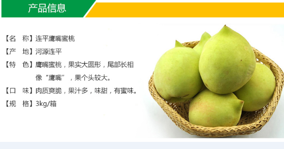 正宗特级连平鹰嘴桃上坪水蜜桃 原产地直供 质量保证新鲜 肉质爽脆 香甜 好味道连平特产,“连平鹰嘴蜜桃”以其色鲜亮、果大肉嫩、味甜爽脆闻名,远销珠三角大中城市,声名日隆,供不应求。已成为广东地区最受欢迎的“绿色水果”之一,连平鹰嘴蜜桃荣获“岭南十大佳果”的称号!